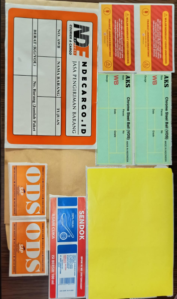 - Material: Sebagian besar label menggunakan kertas thermal transfer (TT) yang dapat dicetak.